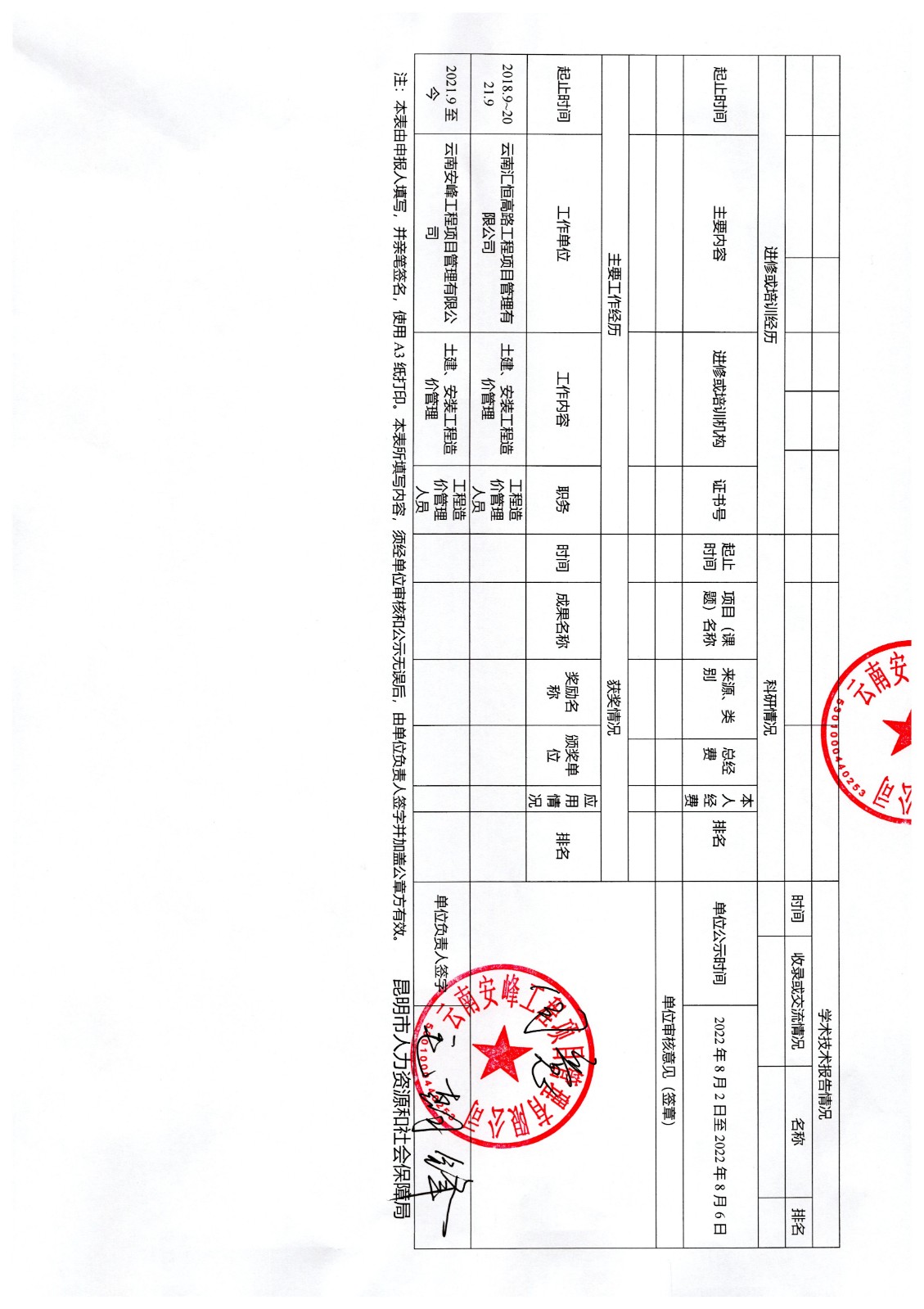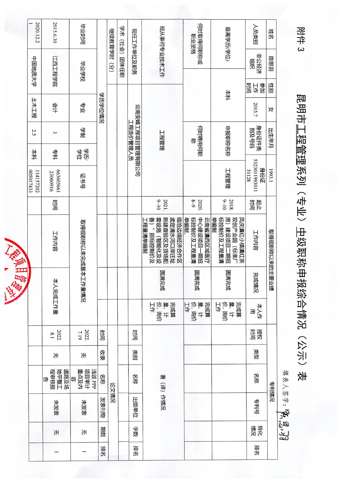 關(guān)于云南安峰工程項目管理有限公司員工陳思羽申報工程管理系列(專業(yè))中級職稱情況公示