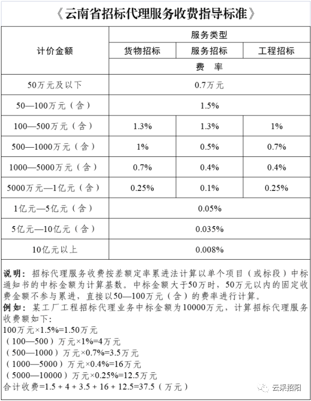 云南省招協(xié)于11月28日發(fā)布了《云南省建設工程招標代理服務收費指導意見》的意見征求稿,云采招陽將征求意見稿的代理服務費計算部分與國家計委印發(fā)的《招標代理服務收費管理暫行辦法》(計價格[2002]1980號)進行了簡單對比,現(xiàn)正式印發(fā)后相關結(jié)論部分仍未變動,具體如下:
