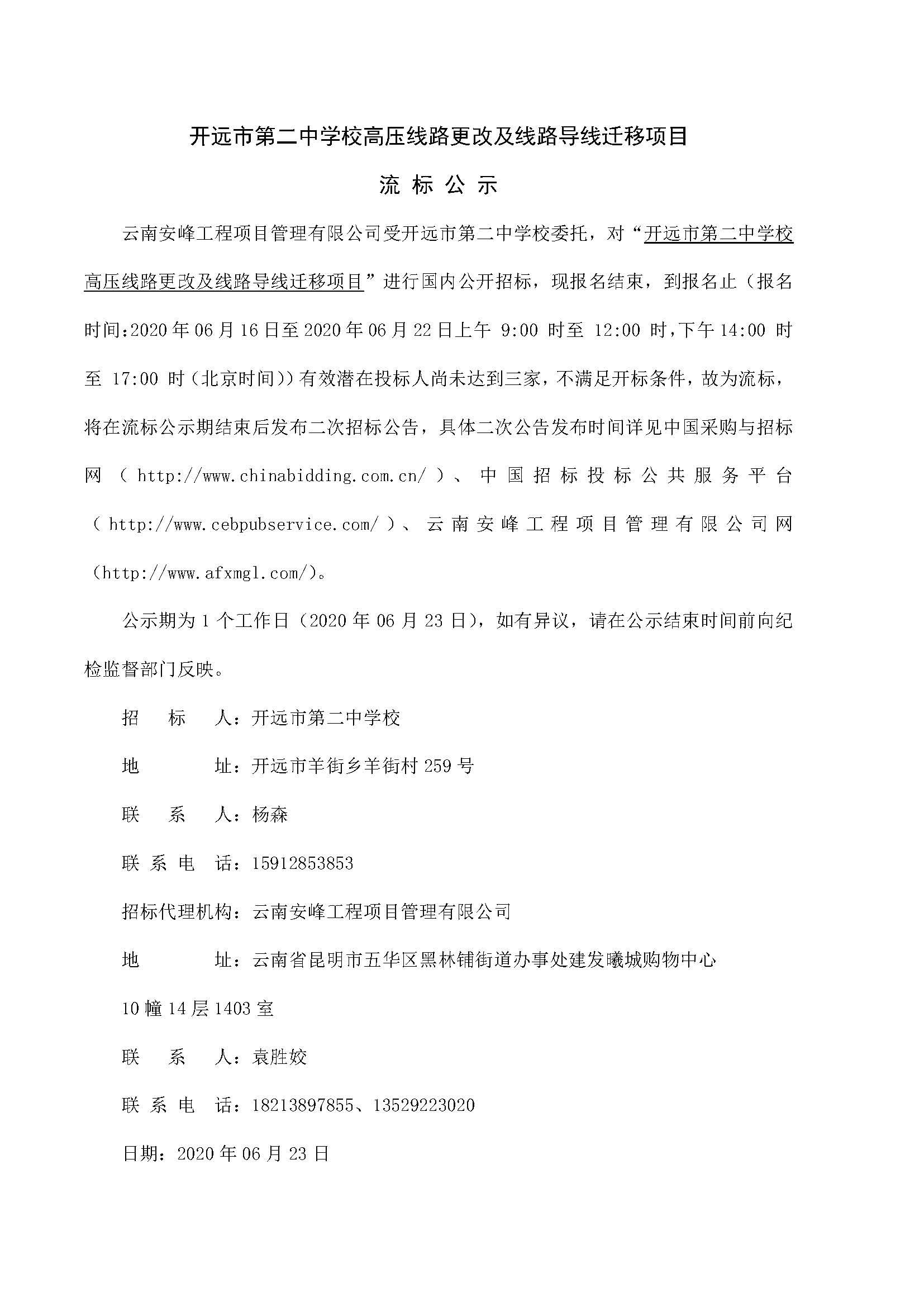 開遠(yuǎn)市第二中學(xué)校高壓線路更改及線路導(dǎo)線遷移項(xiàng)目(二次)流標(biāo)公示