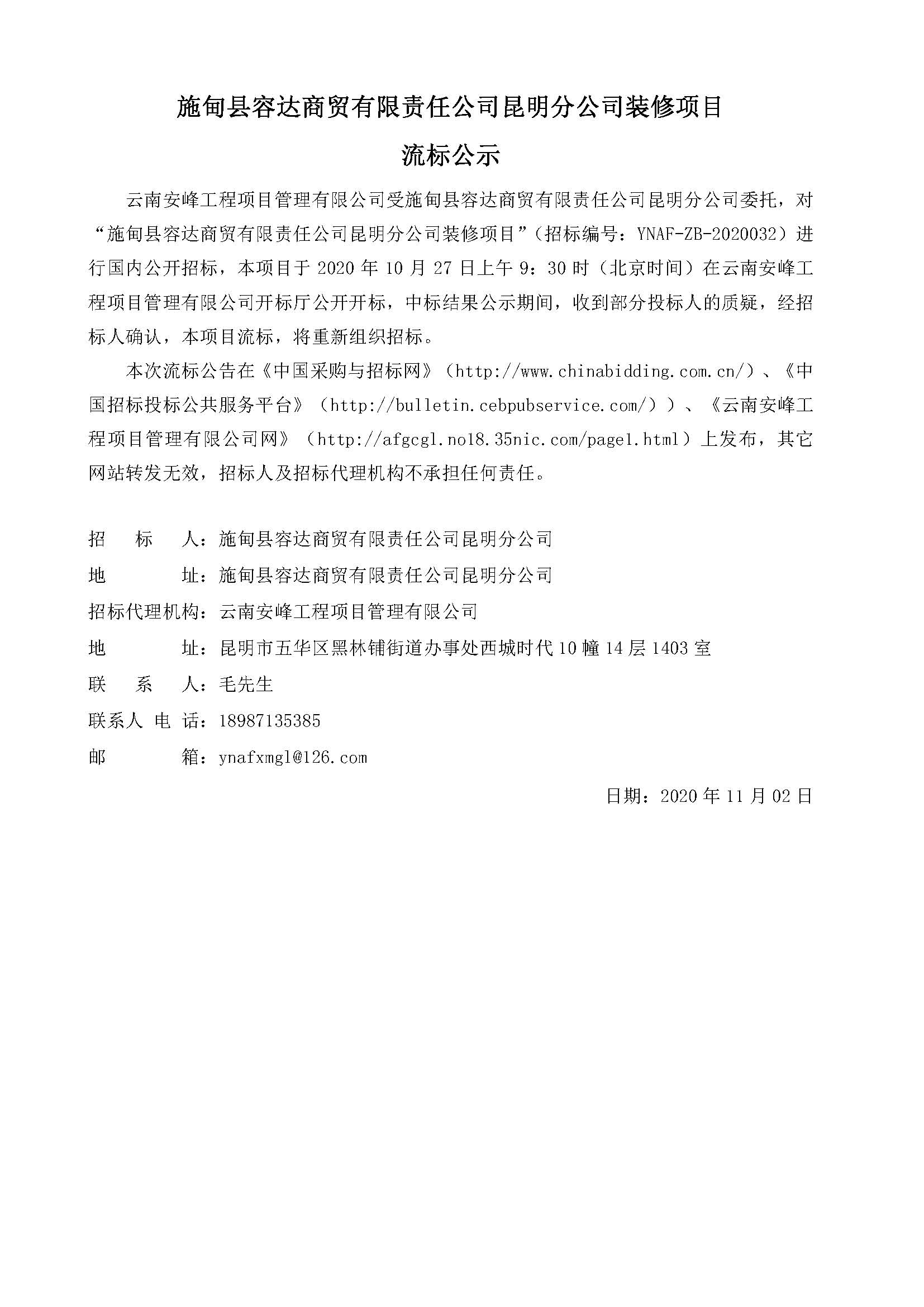 施甸縣容達(dá)商貿(mào)有限責(zé)任公司昆明分公司裝修項(xiàng)目流標(biāo)公示